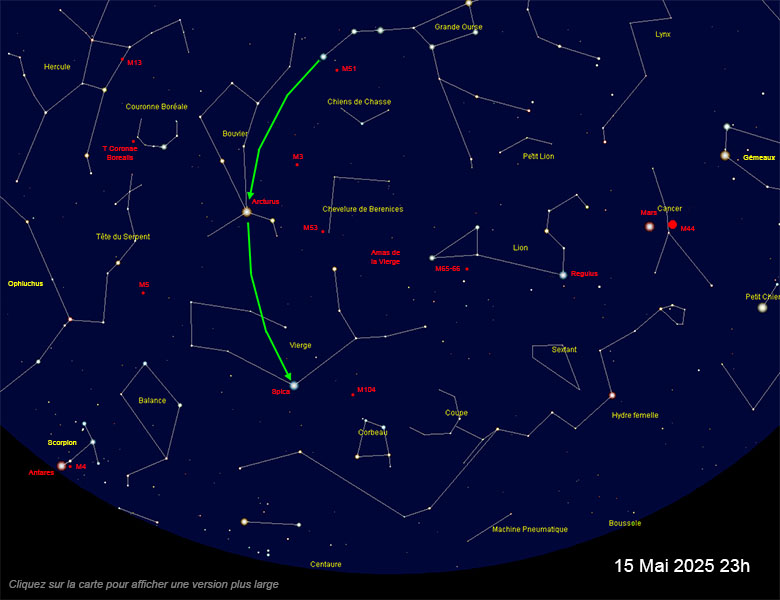 ce qui permet de situer les constellations du Bouvier et de la Vierge. La galaxie indiquée ci-dessous se trouve en fait dans les Chiens de Chasse mais on la trouve depuis Alkaïd. Elle est double (une grosse galaxie « capturant » une