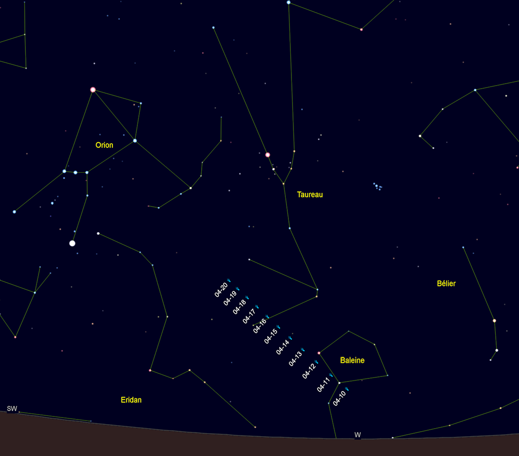 La 1ère comète découverte cette année (par des français) C/2026 A1 Maps passe à son périhélie (point de l’orbite le plus proche du Soleil) le samedi 4. Comme elle fait partie du groupe de Kreutz, des comètes ayant des trajectoires analogues car provenant du même noyau cométaire originel, elle va frôler notre étoile à seulement 1 million de km. Elle a don de bonne chance d’être pulvérisée par la chaleur et les effets de marée (ce qu’on pourrait voir sur les images en ligne des instruments Lasco C3 et C2 de l’observatoire solaire SOHO. SI elle survit, elle pourrait devenir visible en début de nuit très basse vers l’horizon Ouest (6° le 10 à 21h, le 15 à 21h30). Elle montera progressivement dans le ciel mais en s’éloignant de la Terre, donc devenant plus petite et moins lumineuse. Au beoins, cette carte indique ses positions jour après jour : C/2026 A1.