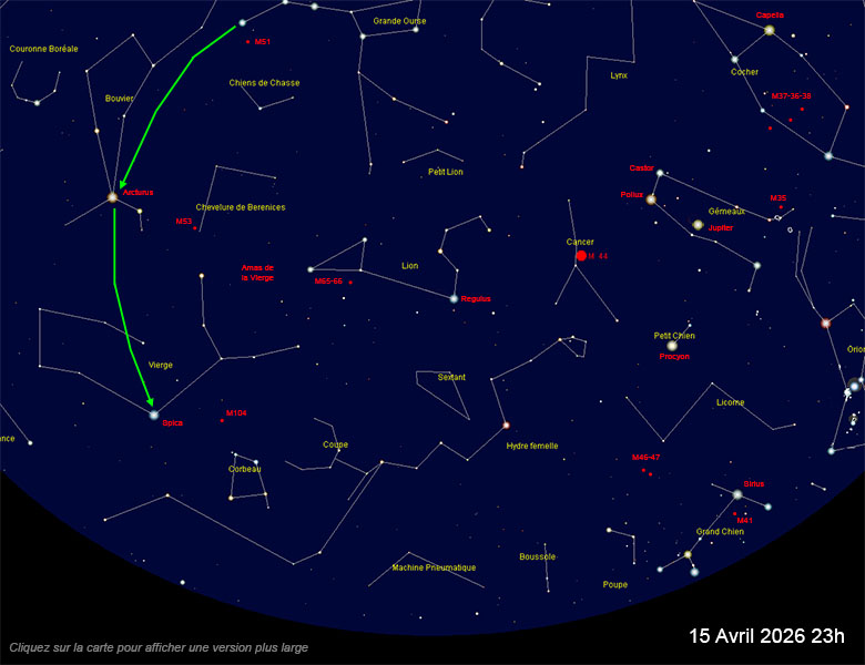 C’est déjà une constellation du printemps qui apparaît. Constellation du Zodiaque, le Cancer n’a rien de remarquable car les étoiles qui le composent sont plutôt faibles. C’est surtout l’amas M44, très étendu et perceptible à l’oeil nu, qui permet habituellement de le situer.
