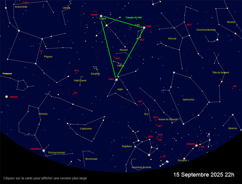 du ciel boréal (après Sirius et Arcturus). Avec Deneb (du Cygne) et Altaïr (de l’Aigle), hors de la carte du mois mais visibles vers l’Est dès le début de nuit, elle forme le fameux « Triangle d’été », figure bien utile pour se repérer